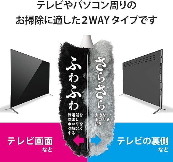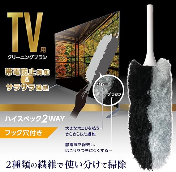 ブラック繊維:帯電防止繊維入りのブラシで、ホコリと同時にテレビ画面の静電気も除去しホコリの再付着を防止!